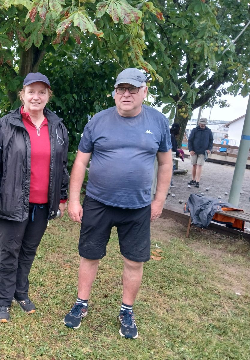 Der Modus bestand aus drei Runden Schweizer System mit Buchholzpunkten, woraus sich eine Tabelle ergab, aus der sich ein A- und ein B-Turnier definierten, die jeweils im K.o.-System ausgetragen wurden. Beide Doubletten landeten im B-Turnier und konnten dann ihre Stärken ausspielen. Beate und Hannes erreichten das Finale und errangen nach hartem Kampf einen hervorragenden 2. Platz. Martin und Manuel mussten sich im Halbfinale gegen die späteren B-Turnier-Sieger geschlagen geben und waren mit einem 3. Platz mehr als zufrieden. Ein Klein-Gerauer B-Turnier-Finale wäre zwar das I-Tüpfelchen gewesen, aber ein 2. und 3. Platz ist eine sehr gute Bilanz, zumal im Teilnehmerfeld einige bekannte und hochklassige Gesichter aus der hessischen Petanque-Szene vertreten waren und durch den zeitweisen Starkregen die Spiele sich teilweise zu Schlammschlachten entwickelten.