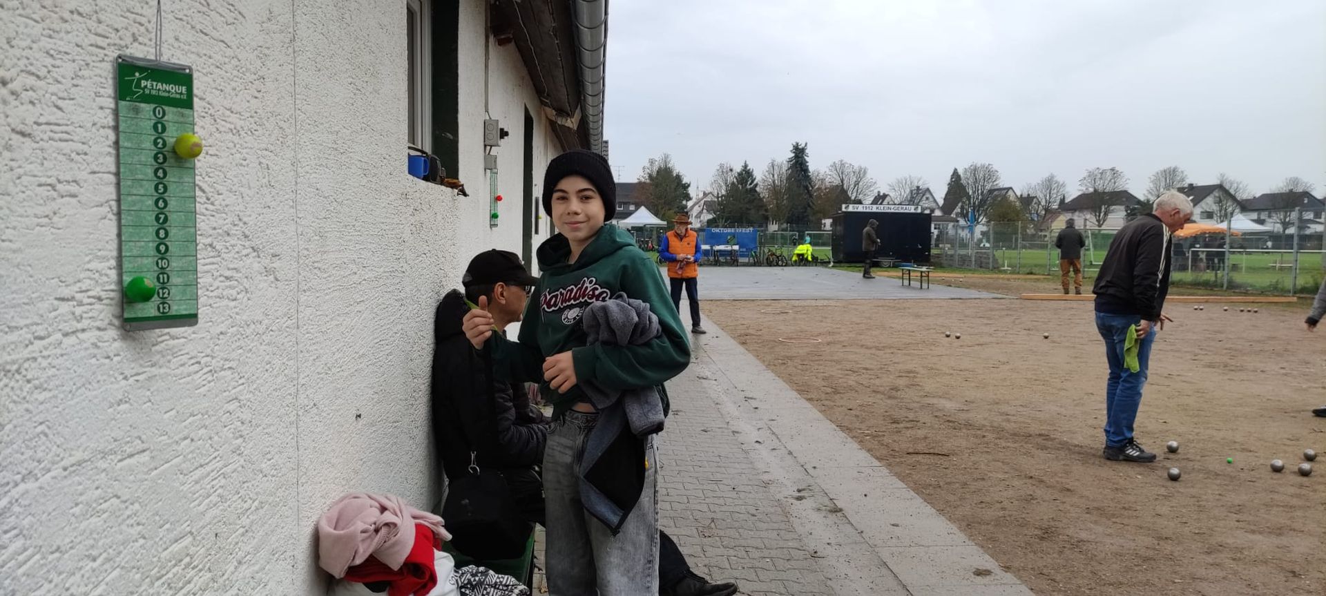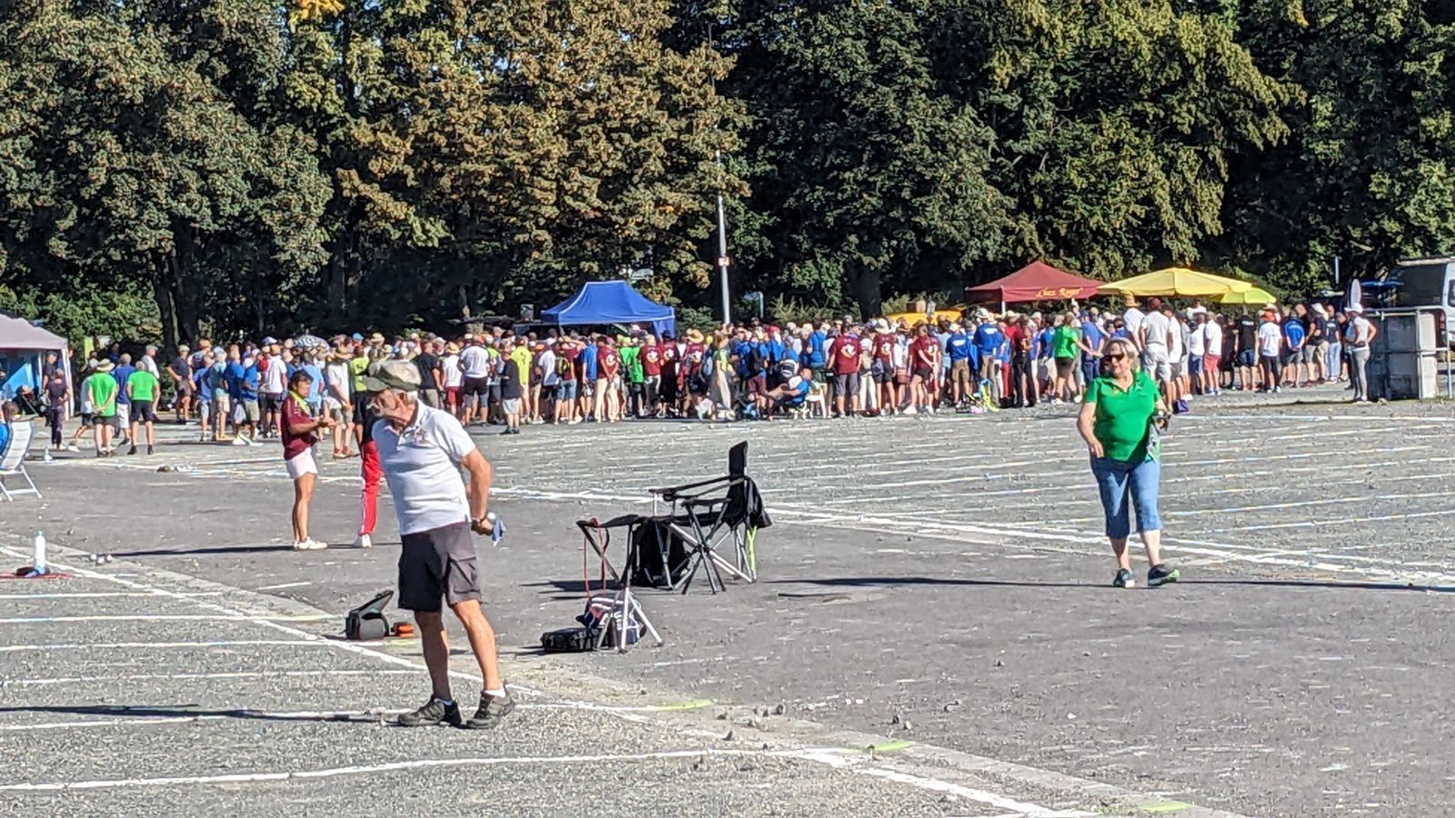 Nachdem wir zuerst für eine Bahn auf dem glatteren Teil des riesigen Geländes ausgelost wurden, stürzte der Computer ab, und es mussten alle Begegnungen neu ausgelost werden. Dabei erwischten wir leider eine der Bahnen mit grobkörnigen Kieselsteinen, die auch noch sehr lückenhaft verteilt waren (siehe Bild). Es hiess erstmal tief durchatmen und umziehen. Zu Anfang des Spieles hatten wir ein paar Schwierigkeiten und lagen nachdem der Gegner auch noch eine 4er Aufnahme erzielen konnte sehr lange mit mindestens 5 Punkten zurück. Diesen Abstand konnten wir im weiteren Verlauf schrittweise bis auf 12:12 ausgleichen, um in der letzten Aufnahme mit unserer letzten Kugel die 13 zu erreichen. Das Spiel hatte extrem lange gedauert, sodass wir praktisch ohne Pause das 2. Spiel anschliessen mussten.