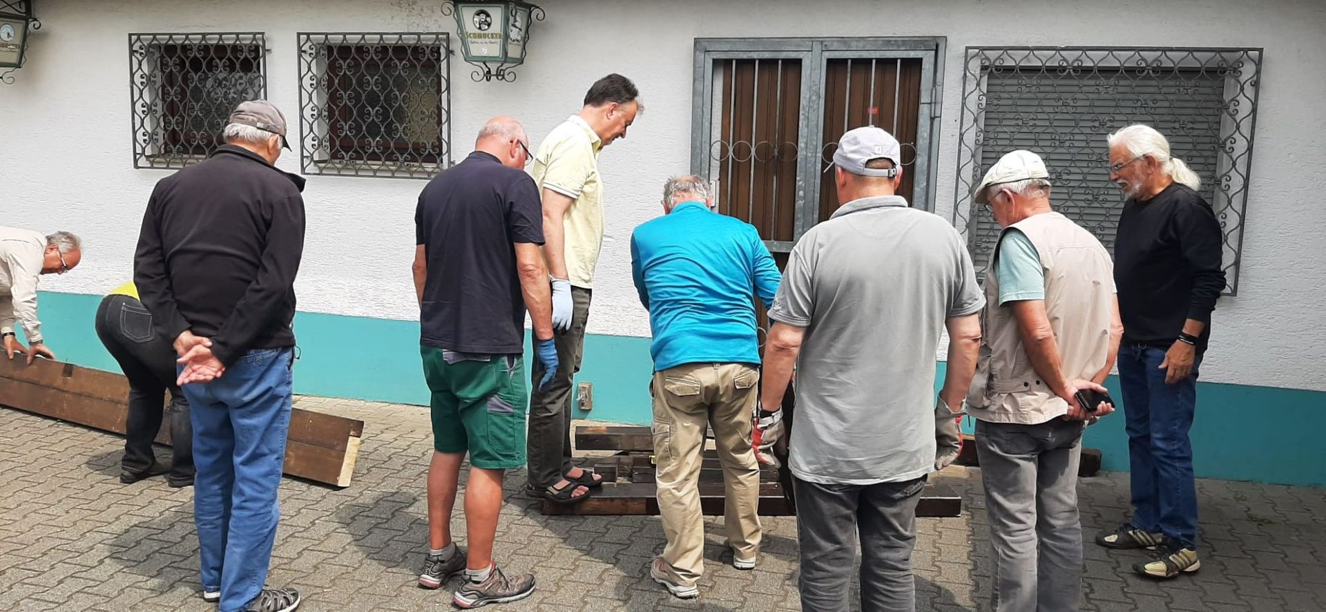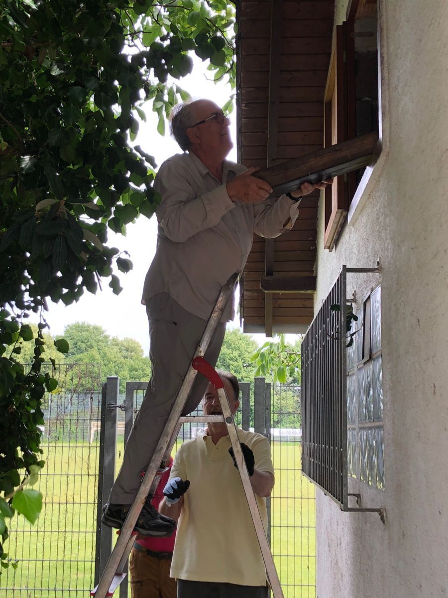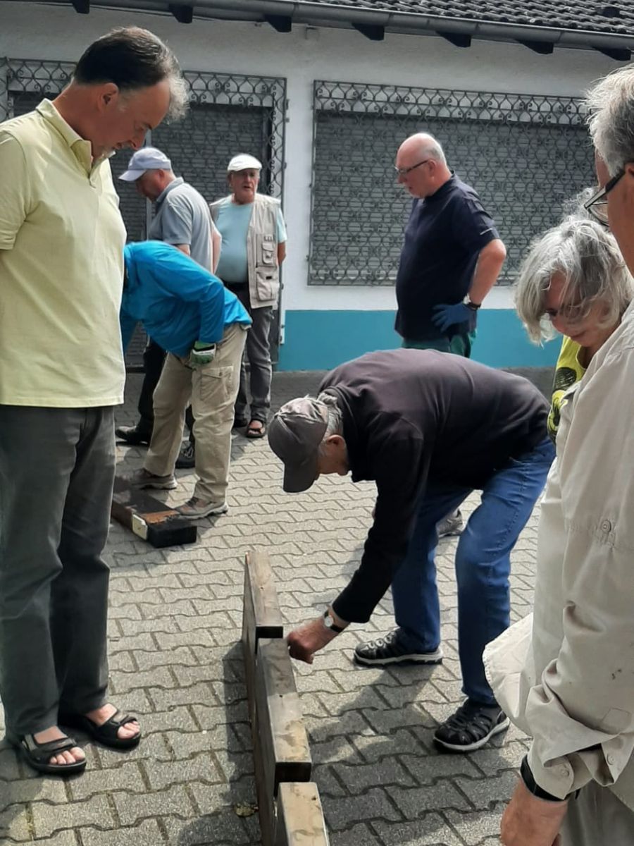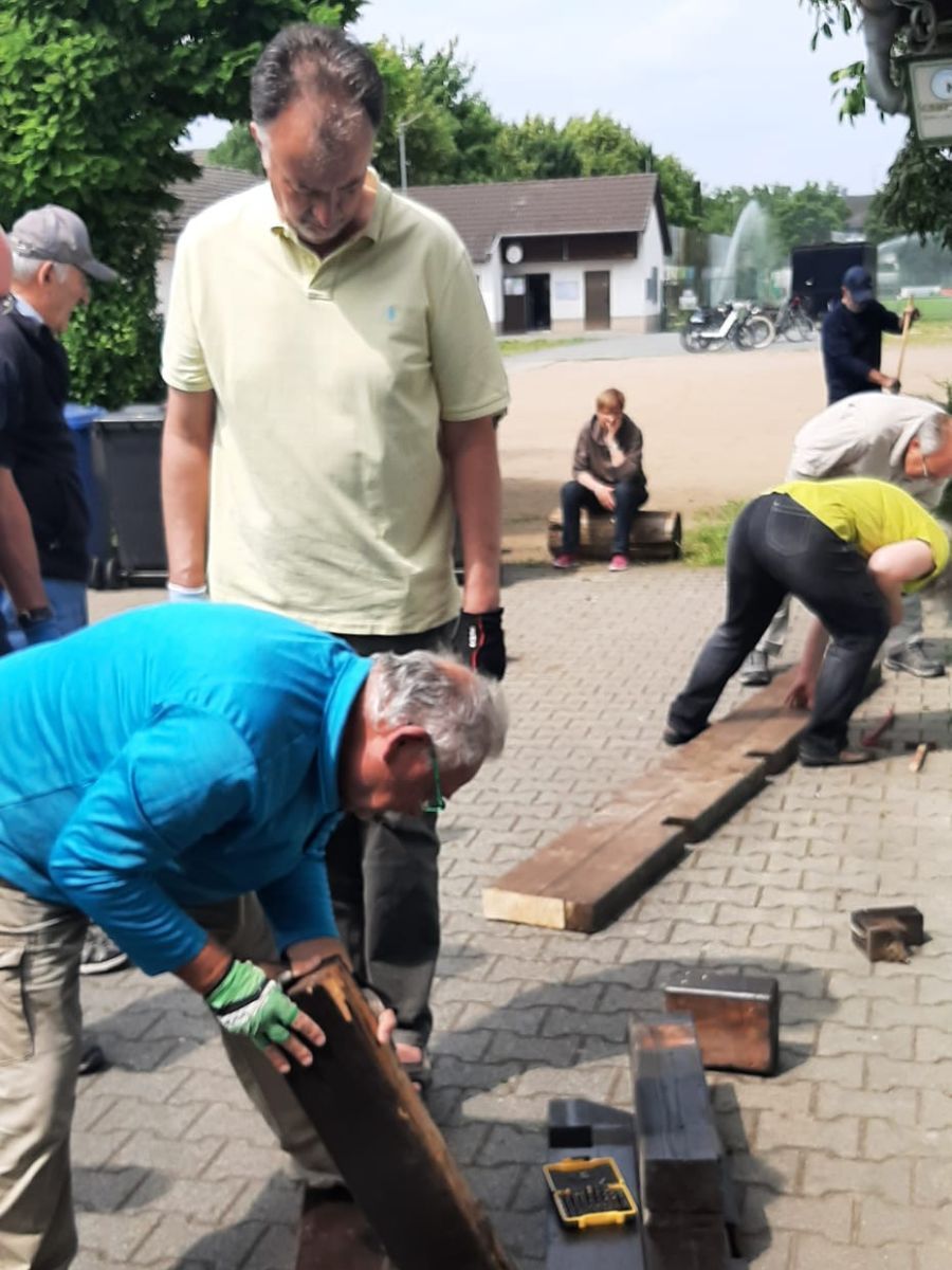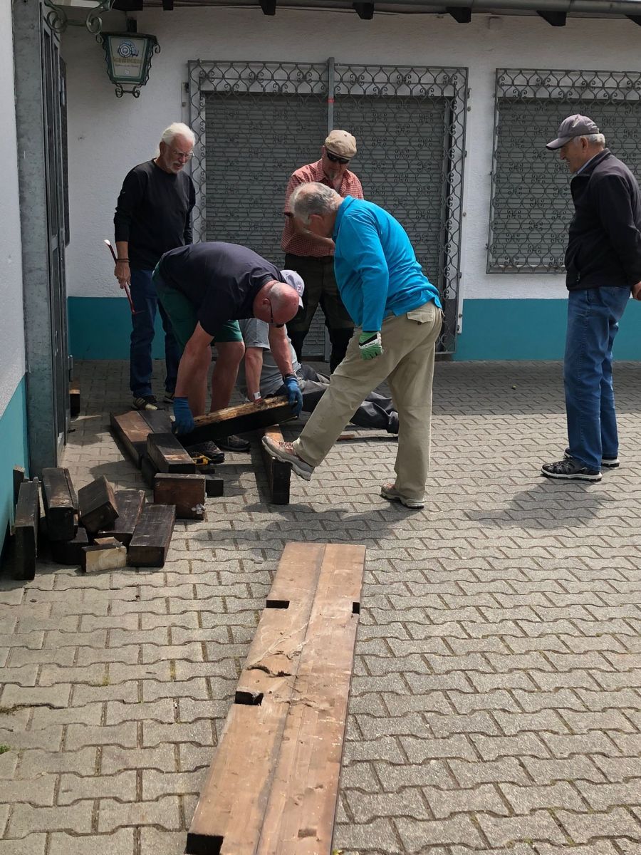 Nach dem Hinweis von Ingrid, dass beim Abbau des Carports eines ihrer Bekannten kostenlos Holzbalken abfallen würden, machten sich einige Abteilungsmitglieder auf, um sie für zukünftige Verwendung zu retten. Dank Ingo wurde auch ein Platz gefunden, an dem diese bis zu der Verwendung als Platztrenner zwischengelagert werden konnten.